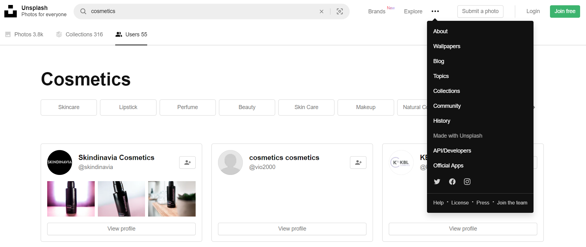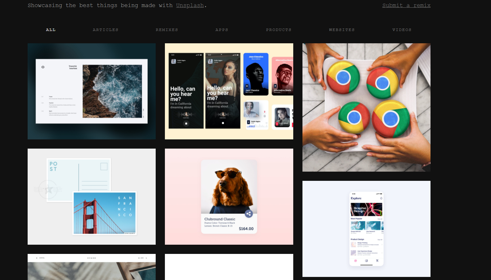 Unsplash примечателен еще и тем, что не только позволяет находить изображения, которые можно использовать в баннерах, но и показывает, какие проекты можно сделать с помощью контента с этой площадки. Нажмите на троеточие в верхнем меню справа и выберите вкладку Made with Unsplash.