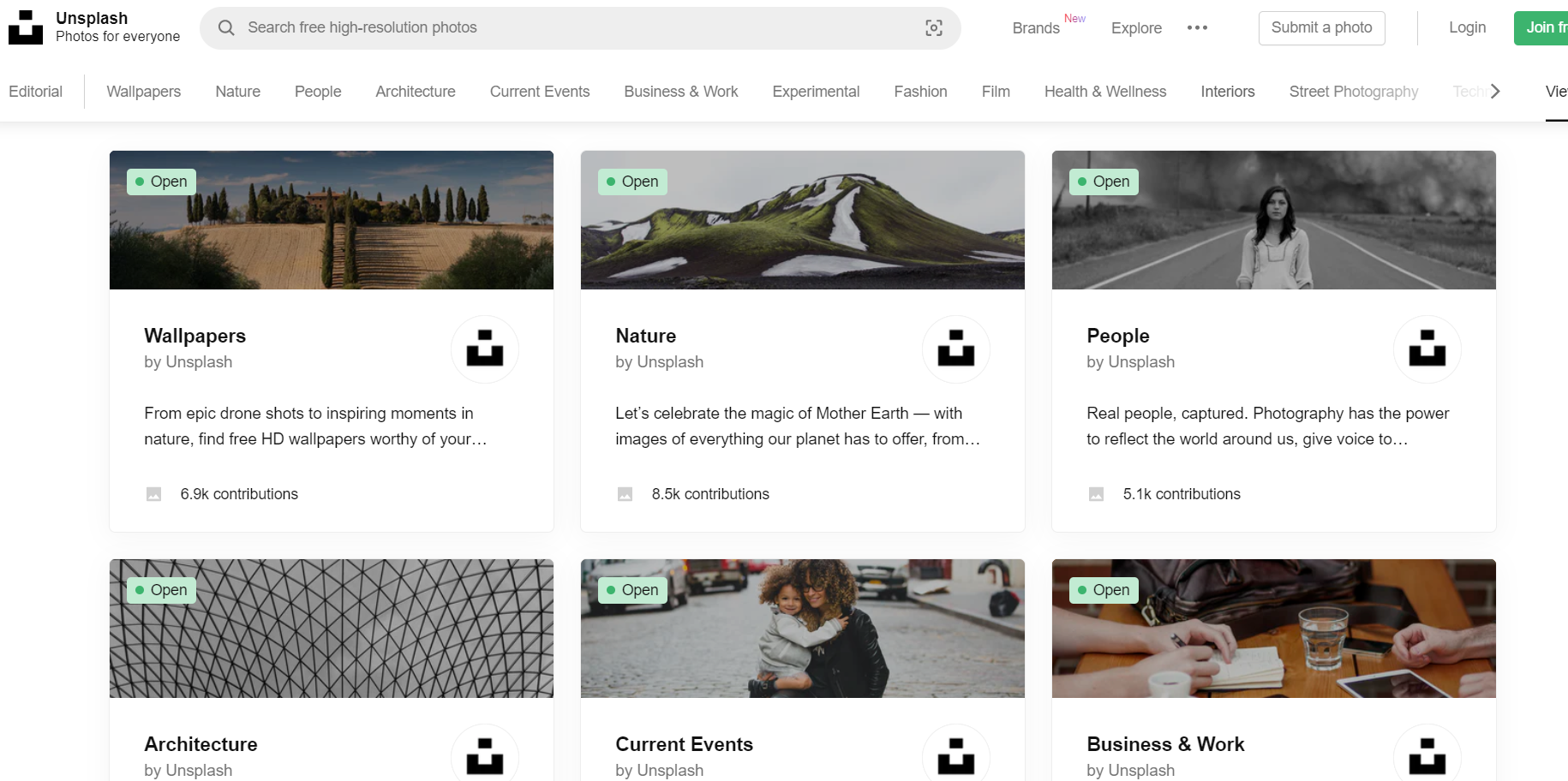 Изображения в Unsplash объединены в тематические коллекции, например, «Природа», «Люди», «Архитектура» и т. д. Найдите коллекцию, соответствующую вашей тематике, и ищите в ней идеи или готовые изображения для баннеров.