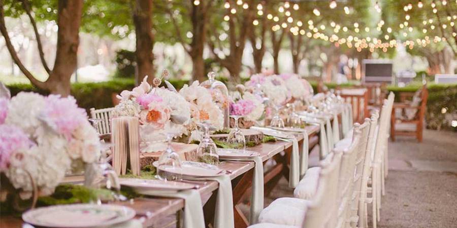 Вторым вариантом для молодых будет подыскать свободное и бесплатное место для празднования – идеально подойдет такое место на природе: лес, сад у родителей или близких друзей. При таком раскладе свадебный декор можно свести практически к минимуму, сделав его из подручных материалов. Подойти для этого может практически все – полевые цветы, нить бечевка, фрукты, овощи и простые лампы для освещения.