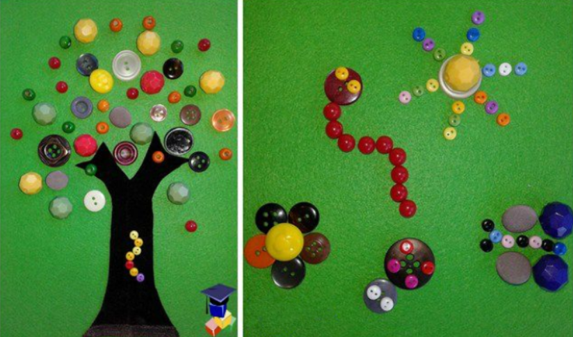 Можно развивать внимательность ребёнка, имея под рукой всего лишь несколько ярких пуговиц. Нарисуйте на листе бумаги какое-нибудь простое крупное изображение: цветок, насекомое, геометрическую фигуру. Дайте ребёнку 2–3 минуты посмотреть на картинку, а потом спрячьте её. Пусть он с помощью пуговиц повторит на столе этот же рисунок, только меньшего размера