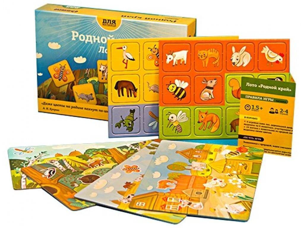 Игра «Родной край» настолько проста, что в неё можно играть с полутора лет. Это лото развивает внимательность и пополняет знания о животных российской стороны. Красивые, узнаваемые картинки, 5 игровых полей. Участвовать могут от 2 до 5 человек.
