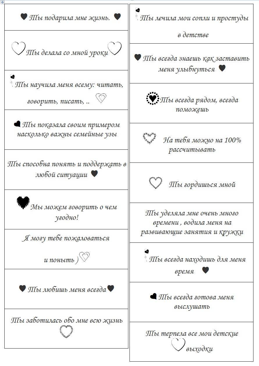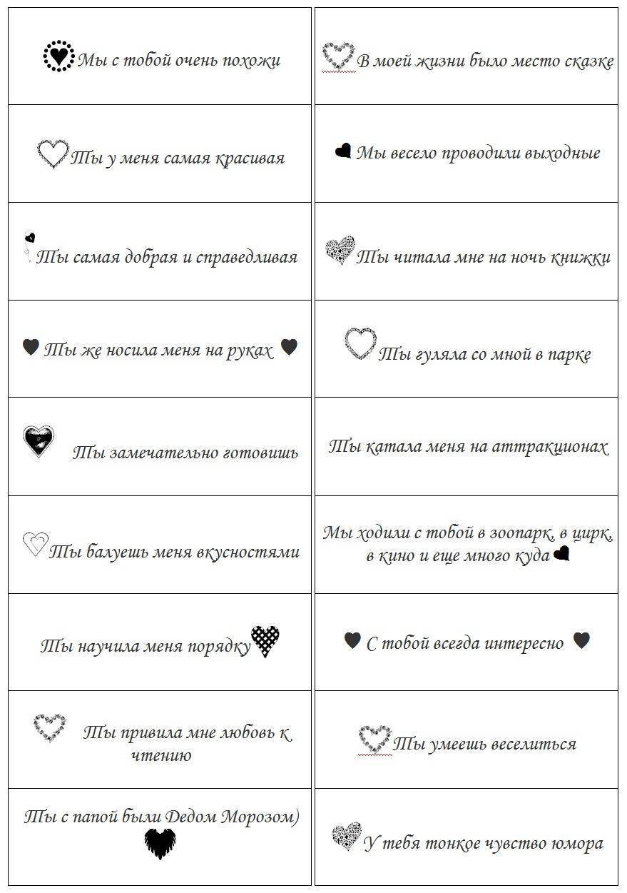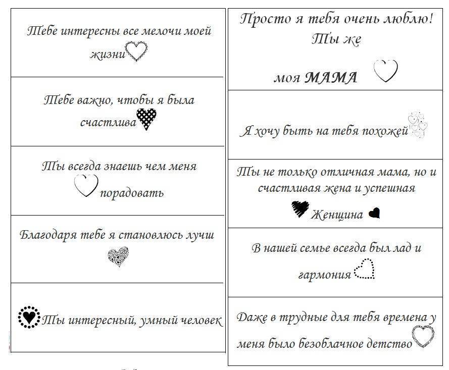Книжка или блокнот – еще один популярный способ для оформления «100 причин, почему я люблю маму». Проще всего воспользоваться готовым блокнотом или красивой записной книжкой, украсив обложку и заполнив странички признаниями. Если знакомы с основами скрапбукинга, можно создать оригинальную книгу « с нуля», оформляя обложку и каждый листочек отдельно, а потом соединить все воедино лентой, кольцами или другими приспособлениями. Идеи оформления своими руками книги-подарка «100 причин, почему я люблю маму» — на фото.