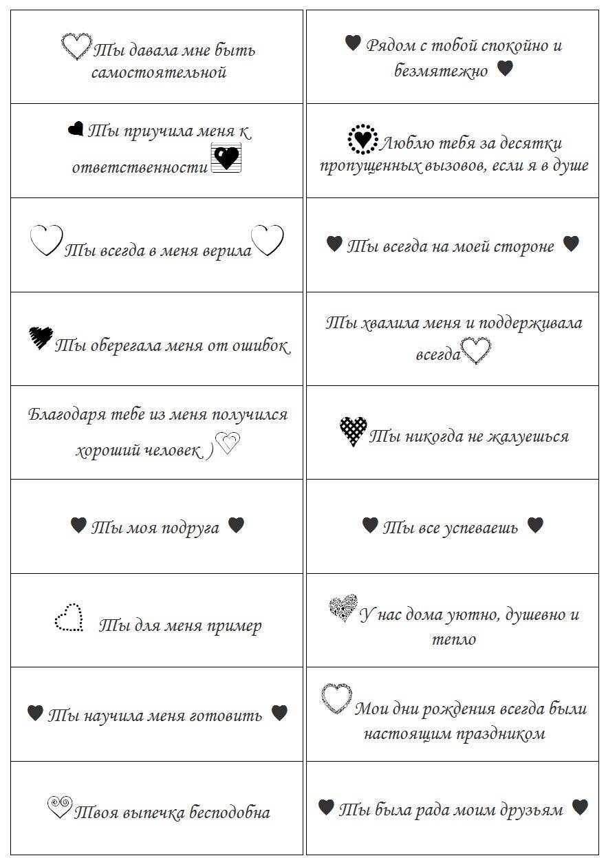 1. …с тобой я ощущаю себя самой счастливой на свете. 2. …у тебя отменное чувство юмора. 3. …с тобой я как за каменной стеной, чувствую себя защищённой. 4. …ты заставляешь меня искренне улыбаться даже в ненастные дни. 5. …ты мне не надоедаешь. 6. …от тебя я всегда могу ждать моральной поддержки. 7. …благодаря твоим комплиментам у меня нет комплексов: я знаю, что я симпатичная. 8. … иногда мне кажется, как будто ты читаешь мои мысли. 9. … я чувствую себя желанной рядом с тобой. 10. …ты и возлюбленный, и друг одновременно. 11. …твоя готовность сорваться ко мне в любую минуту восхищает. 12. …с тобой я поняла, в чём смысл женского счастья. 13. …твои обещания не бывают пустыми. 14. …иногда я могу побыть с тобой капризным, вредным ребёнком. 15. …ты приходишь ко мне во снах. 16. …у тебя завораживающий голос. 17. …ты способен с лёгкостью рассмешить меня. 18. …ты никогда не ударишь меня. 19. …я могу почувствовать себя настоящей женщиной. 20. …я нашла «идеального принца».