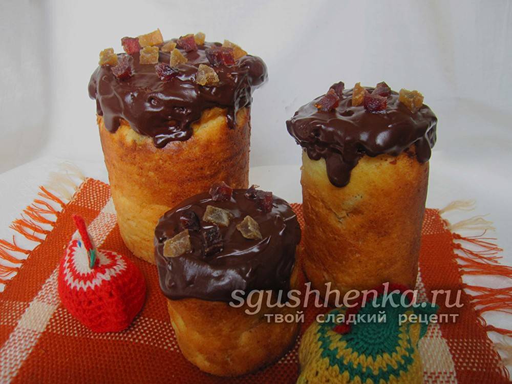 По истечении времени выпечку достают из духовки, но оставляют в формах еще на 5-7 минут, чтобы она не разломалась. Пока куличи остывают, готовят глазурь. Для этого на водяной бане топят шоколад и сливочное масло. Еще горячей глазурью поливают куличи, а сверху украшают присыпкой или фруктами.