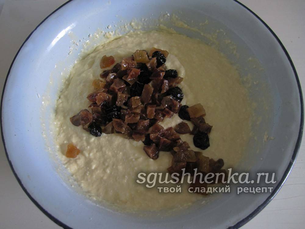 Далее, опять замешивают тесто. В общую массу добавляют размягченное сливочное масло и яйца. Когда все компоненты соединяться, высыпают оставшийся сахар, ванилин и перетертый через сито творог. Всю массу перемешивают до однородности при помощи миксера. Сухофрукты пропаренные, нарезанные кусочками и просушенные, добавляют в тесто.