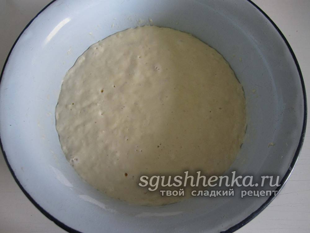 По консистенции масса получается не слишком густая, больше похожа на сметану или крем. Ее накрывают пищевой пленкой или полотенцем и ставят в тепло для брожения. Спустя час тесто увеличится в объеме, поэтому его еще раз перемешивают ложкой и оставляют подниматься еще в течение 30 минут.