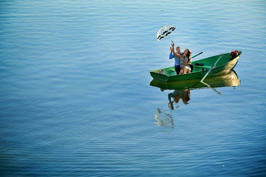 - Водоем. Вы можете взять за основу разные идеи, например, пикник, веселое купание, романтический закат, катание на лодках или катере. Такая локация подойдет как для приверженцев тихой и спокойной обстановки, так и для пар, которые приветствуют экстремальные виды отдыха. Для последних можно устроить фотосессию на байдарках.