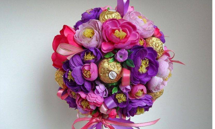 Каждая женщина получает на 8 Марта цветы, но она будет невероятно рада, если букет окажется сладким. Для изготовления букета из сладостей желательно брать небольшие и легкие конфеты.