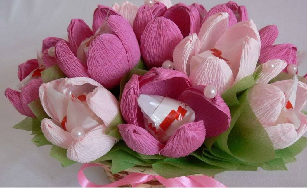 Для получения эффекта «вау», нужно спрятать сладость так, чтобы она не бросалась в глаза. Сейчас очень популярны самодельные букеты
