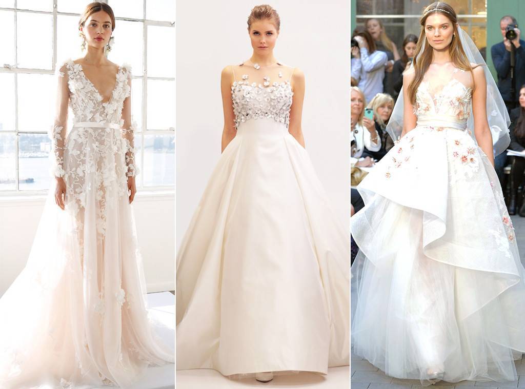 Традиционные платья с пышной юбкой представляет Vera Wang и Carolina Herrera. В их коллекциях модели украшаются роскошными бантами, 3D-принтами и кружевными вставками. Дополнительные ярусы на юбке из воланов, пышные оборки на лифе и корсетная форма — все это позволяет уменьшить громоздкость моделей.