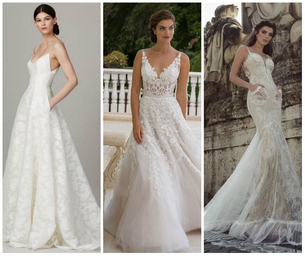 Почти во всех коллекциях свадебных платьев 2021 были замечены вырезы и спереди, и сзади (невестки, будьте готовы обнажиться в глубокие декольте и в иллюзионные лифы: но почему невестки, это надо женихам посоветовать быть готовыми к смелым невесткам), обнаженные плечи, глубокие v-образные вырезы на свадебных платьях.