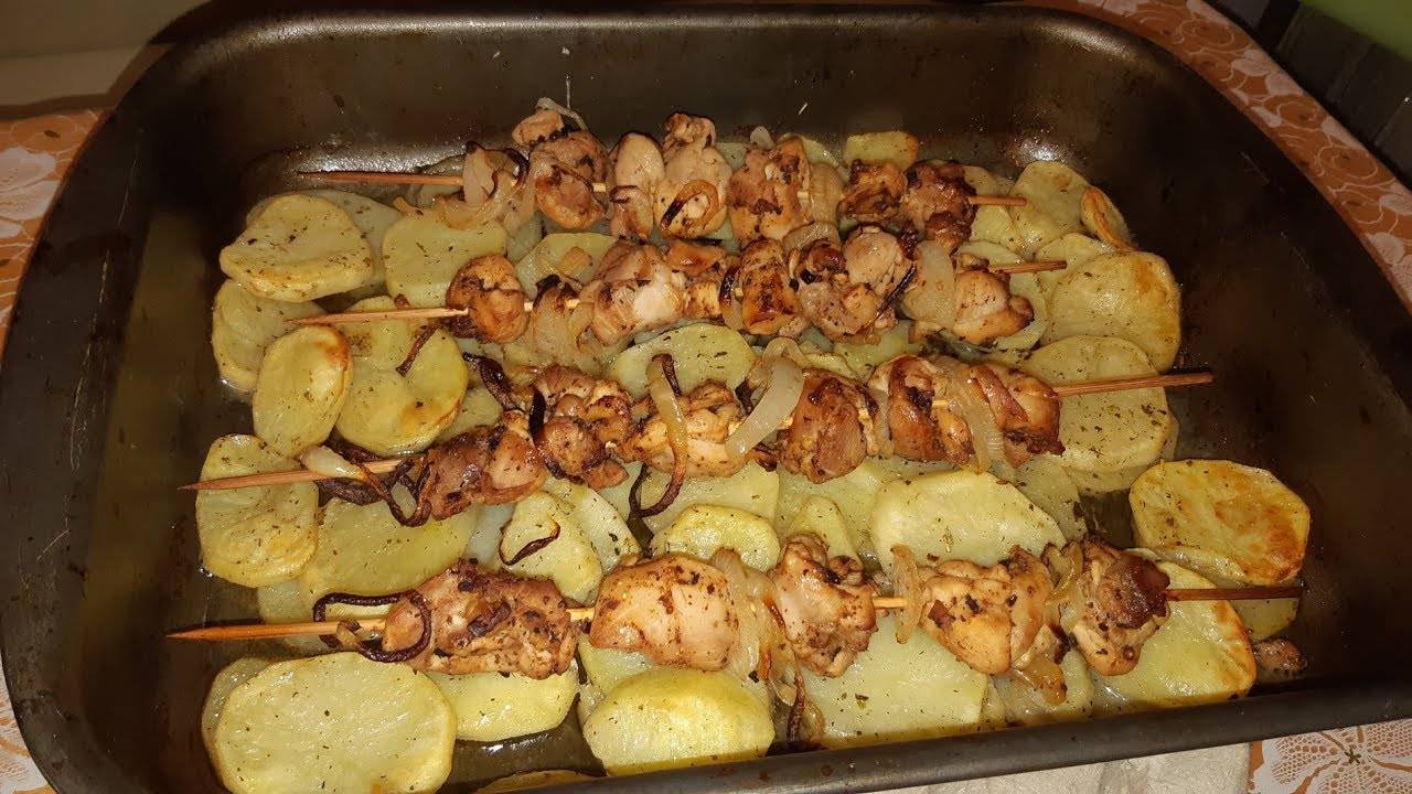 Если вам нужно приготовить вкусное блюдо «два в одном» — мясо и гарнир, тогда обязательно сделайте шашлык из курицы в духовке с картошкой. Отлично подойдет для полноценного ужина для небольшой семьи из 3-4 человек.