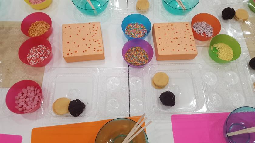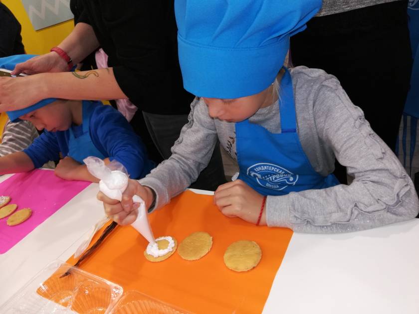 “Детки делали маршмеллоу в глазури. Чудесный десерт. У нас в семье был признан самым вкусным)). Делается просто. Насчет мисочек с глазурью и украшением, ну меня честно особо не напрягало, что им приходилось общаться с соседом и договариваться, делая десерт по очереди)). Затем пирожное с кремом, ну почти мини-тортик. Тут все просто и понятно – бисквит заполняется кремом и украшается по вкусу. Опять же надо добыть украшения, но рядом были мамы и они помогали. Думаю, даже если и не было нас там, детки бы отлично договорились.”