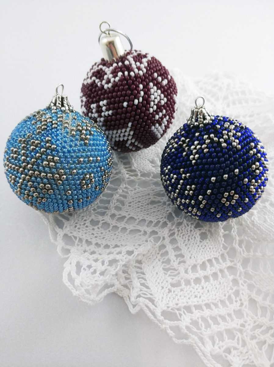 Другой вариант – использовать инструкции для плетеных бисерных браслетов новогодней тематики. По ним можно вышивать на шариках и круглых игрушках. Такая вышивка будет опоясывать шар только по диаметру, а остальное пространство вы оставите незаполненным.