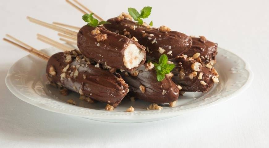 2. По центру вставить палочку и готовые канапе выложить на праздничное блюдо. Полить шоколадным топингом по своему вкусу.