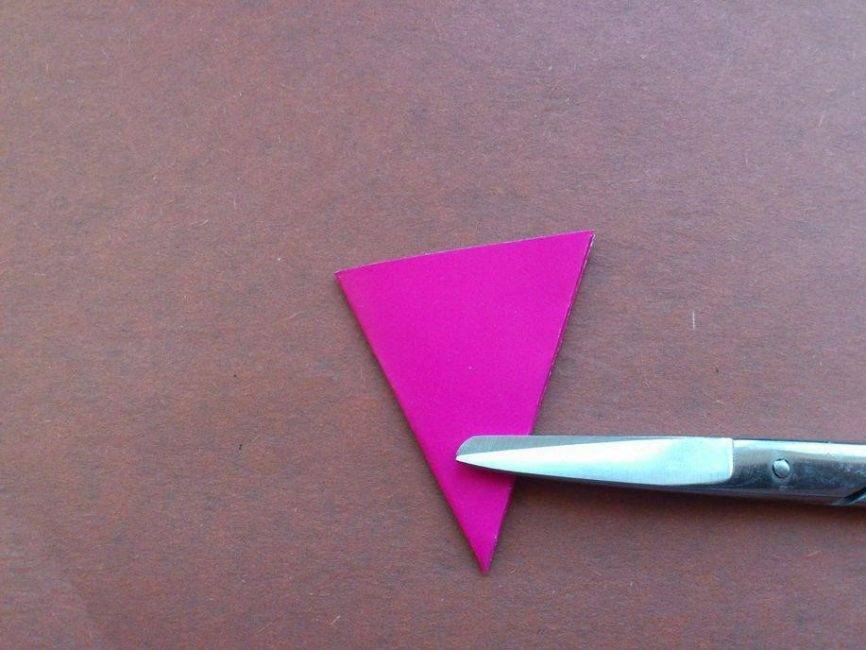 - Снова готовим квадраты: складываем по диагонали лист и отрезаем лишний прямоугольный «хвост. Треугольник, который получился, не разворачиваем, а снова складываем в меньший треугольник.