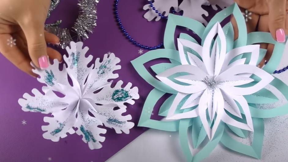 Существует несколько вариантов, как сделать объемную снежинку из бумаги своими руками. Ее можно сделать разноцветной, использовать блестки. Но вначале попробуйте сделать снежинку из обычной белой бумаги. Можно сделать снежинки в стиле оригами или использовать навыки квиллинга, а также для создания снежинок можно взять втулки от туалетной бумаги.