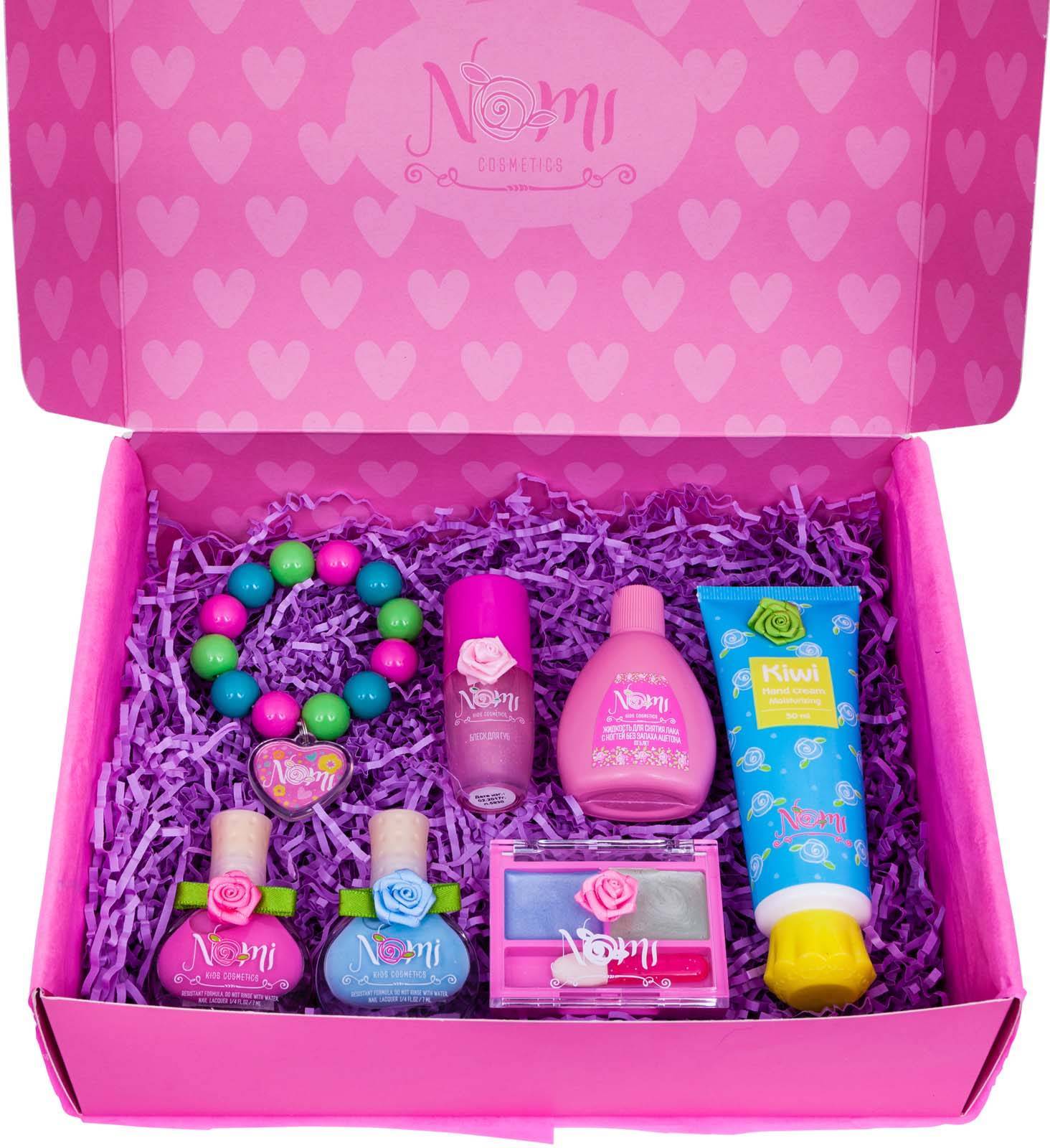 - Детский косметический набор для ухода за собой. Его можно собрать самостоятельно: лаки для ногтей, сухие духи, гигиеническая помада или блеск для губ, нежирный крем.