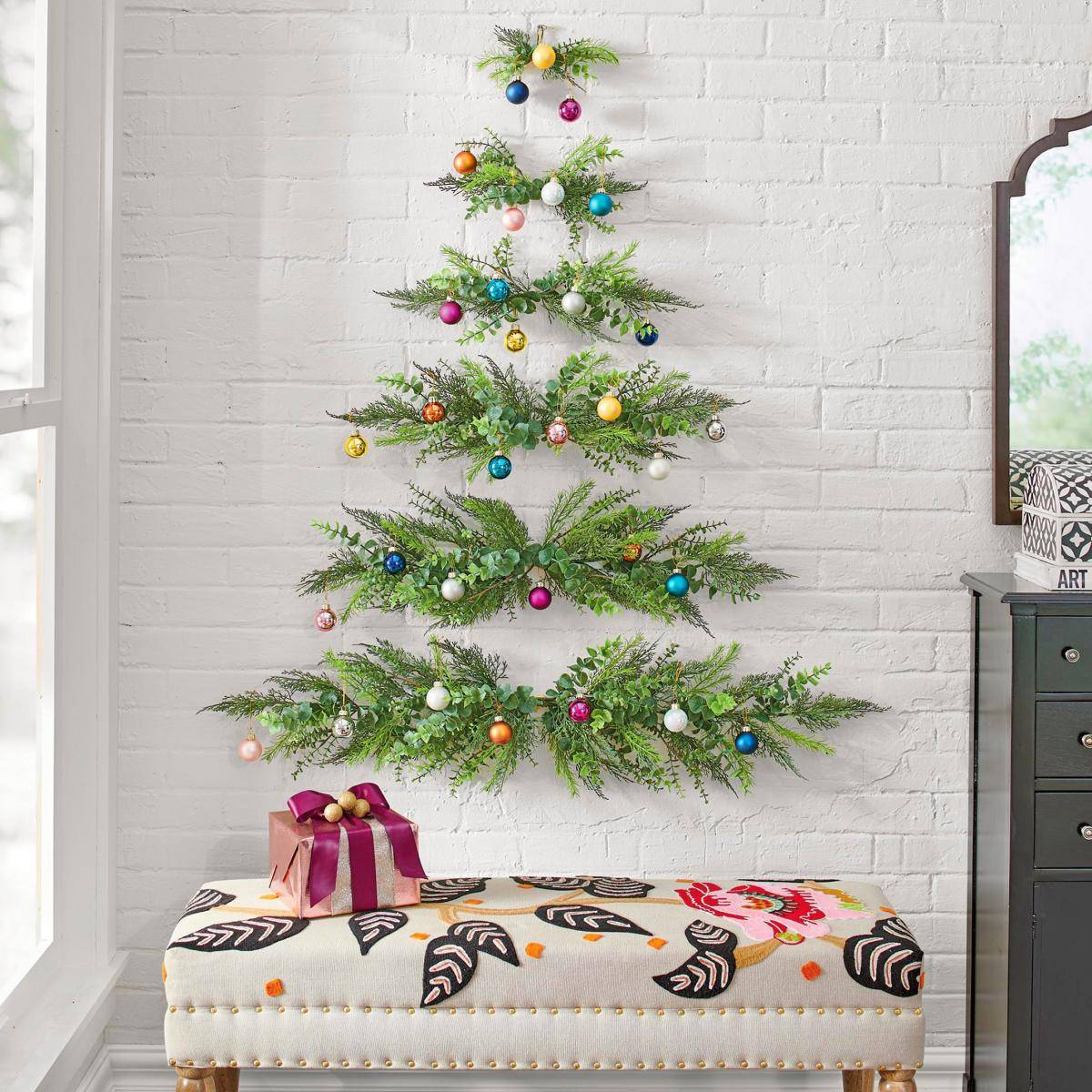Маленькая квартира – это не повод отказываться от новогодней елки, ведь такое украшения можно сделать своими руками. В виде новогоднего дерева можно закрепить гирлянду или еловые веточки, украсив их яркими шариками.