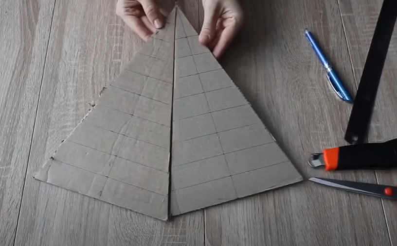 - Для елочки на маленькой ножке также вырезаем два треугольника размерами 18 на 20 см и делим на 4 части по 5 см.