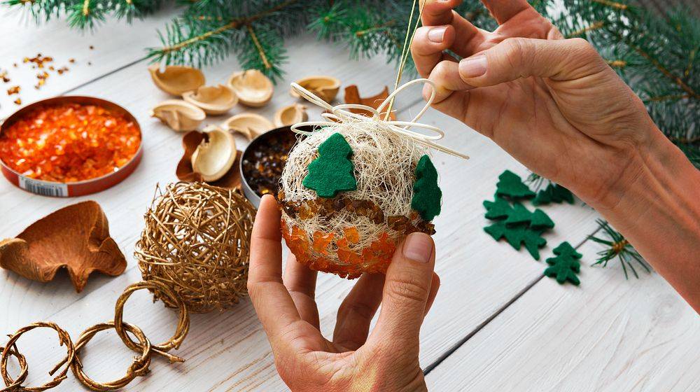 - Украсьте елочную игрушку блестками, бисером, бусинами, ленточкой, бантиком или любым другим декором.