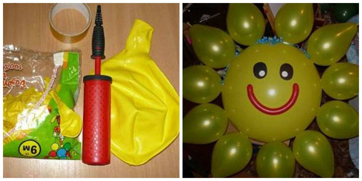 Чтобы сделать основу для нашего солнышка, мы надуваем с помощью насоса большой желтый шар, который будет личиком. Затем надуваем 10 или 12 небольших желтых шаров. Количество шаров на лучики зависит от размеров надутого вами личика солнышка.