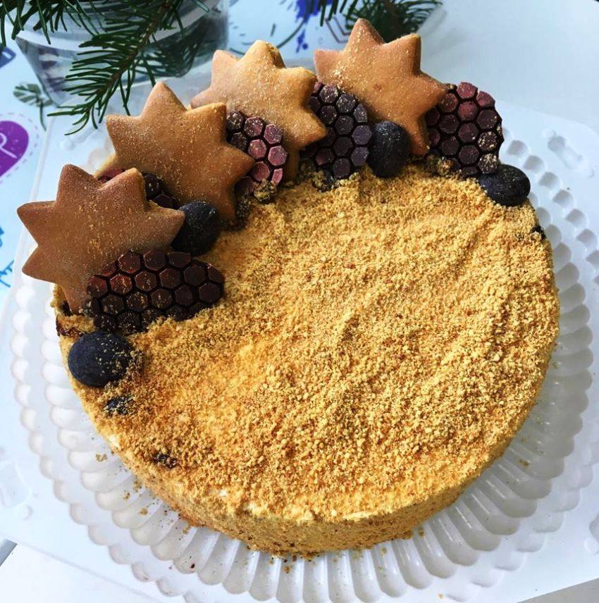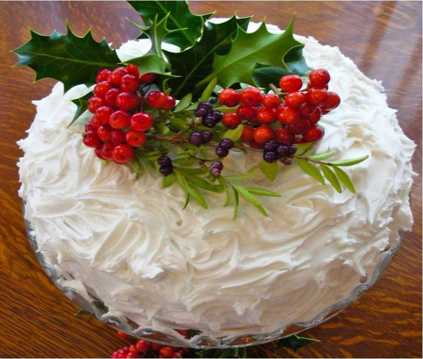 Первый пример – украшение новогоднего торта из нежного воздушного крема, имитирующего снежную гладь. Верхушка украшается зеленью и ягодами – отличная имитация нашей зимы.