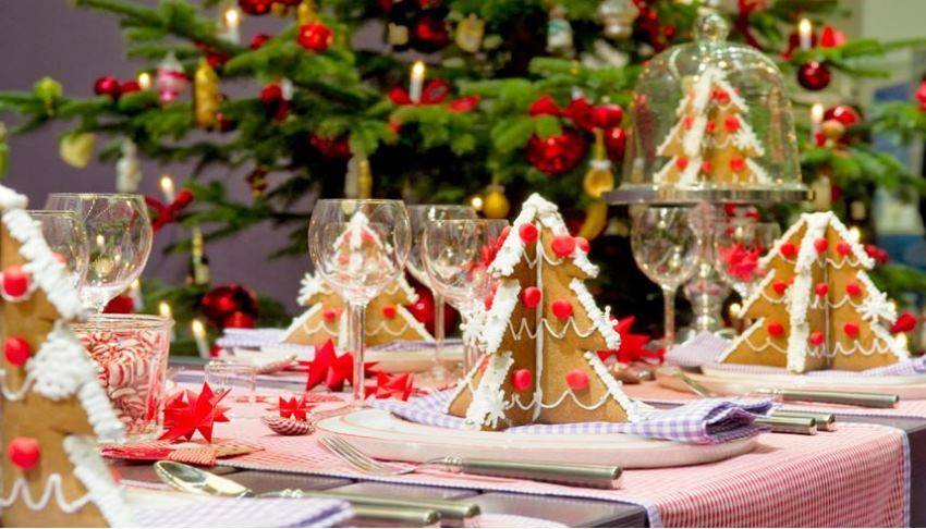 - выбрать основной цвет для скатерти, салфеток и декоративных элементов. Чаще всего главным оттенком является красный, но его можно заменить на белый, золотистый или даже зелёный;