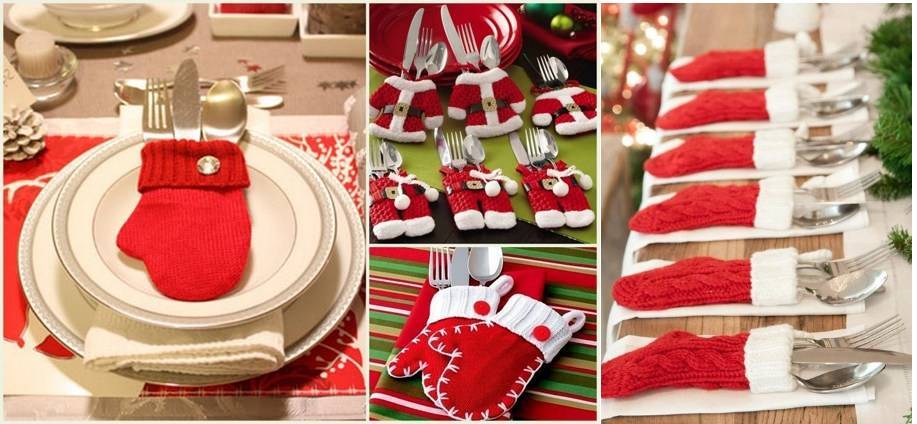 Оригинально выглядят вязаные чехлы для столовых приборов в виде атрибутов Санты