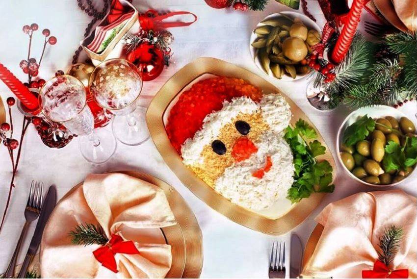Каждое приготовленное блюдо укладывается в красивые тарелки с золотистой или серебряной каёмкой. Салаты и нарезки можно украсить вымытыми еловыми ветками, а также ягодами.