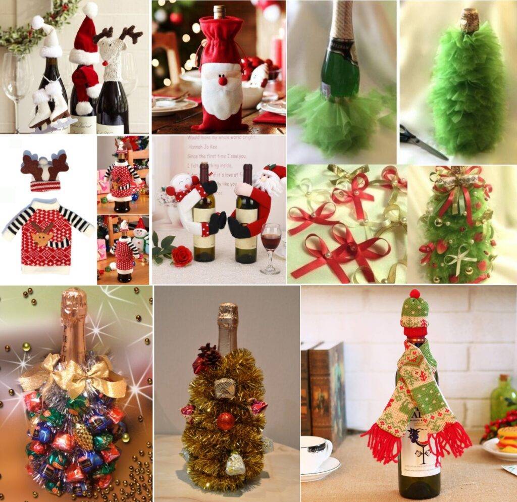 бутылки к Новому Году можно украсить разнообразными шапочками и чехлами, задекорировать под елочку, украсить мишурой