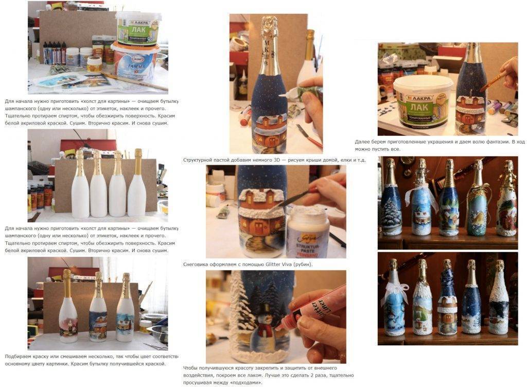 Мастерицы расписывают стеклянную посуду зимними сюжетами, используя технику декупаж. При кажущейся сложности такой работы, выполнить ее может каждый, изучив элементарные методы техники. Новогодние праздники дают возможность испробовать свои силы в этом творчестве и украсить стол своими руками к 2021 году неординарно и изысканно.