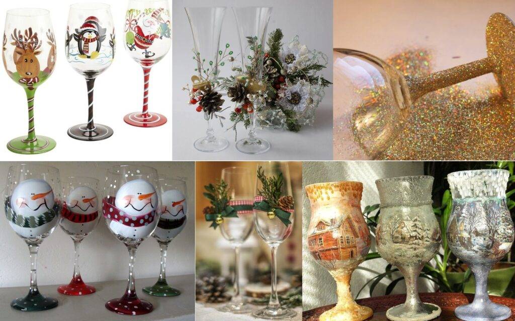 Задекорировать бокалы на Новый Год можно самостоятельно при помощи еловых веточек, лент, блесток, а также нанести рисунок