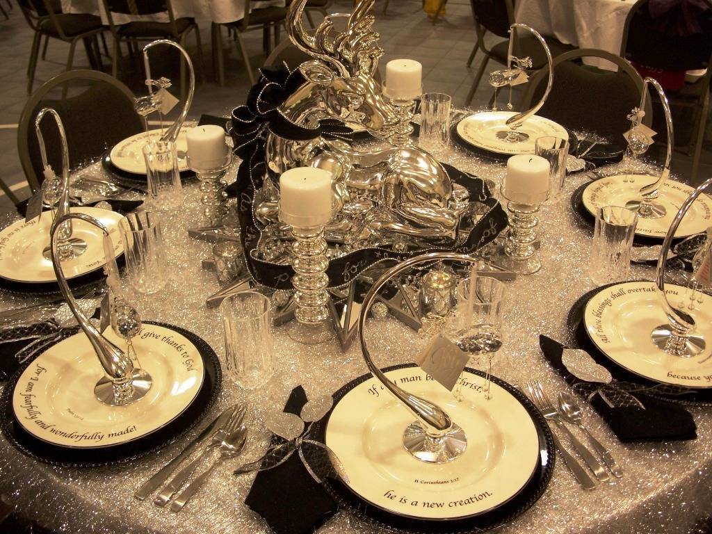 Если нет специальной праздничной скатерти, то можно накрыть стол той что есть, собрав гармошкой её края, в нескольких местах закрепив бантами на булавках. Это украсит даже самую будничную скатерть.