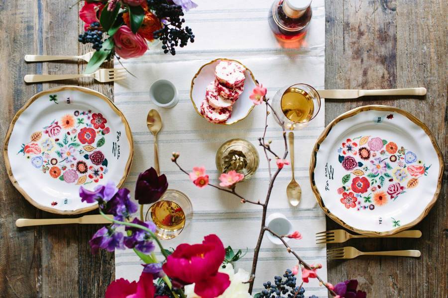 Удачным выбором для дня рождения станет посуда с окантовкой. Белоснежность и золото буду прекрасно сочетаться с тёплым цветом скатерти. Если же вы остановили свой выбор на насыщенном ярком цвете, то используйте цветную посуду, подобрав удачный контраст.