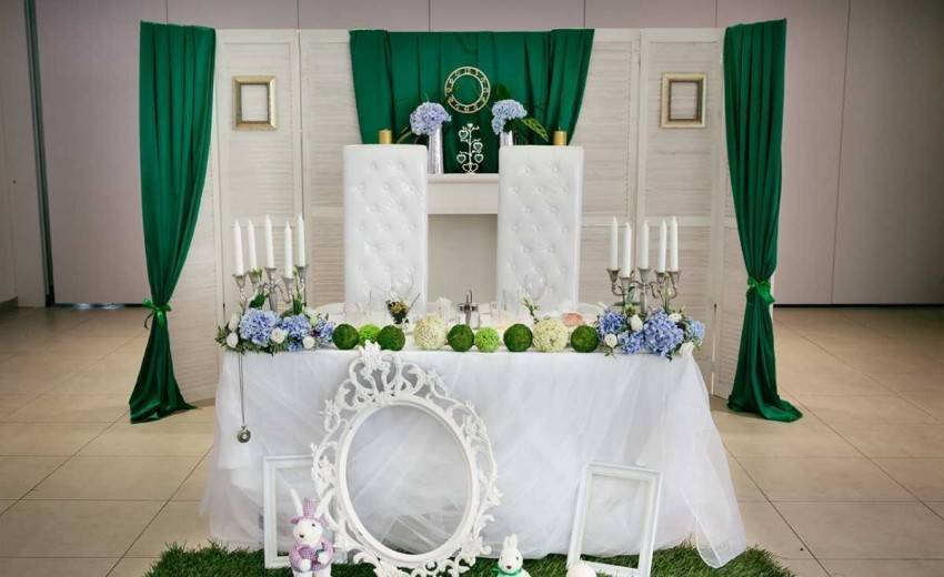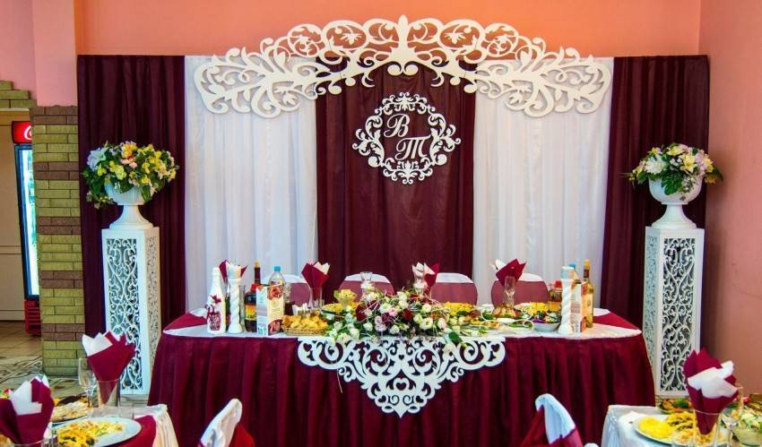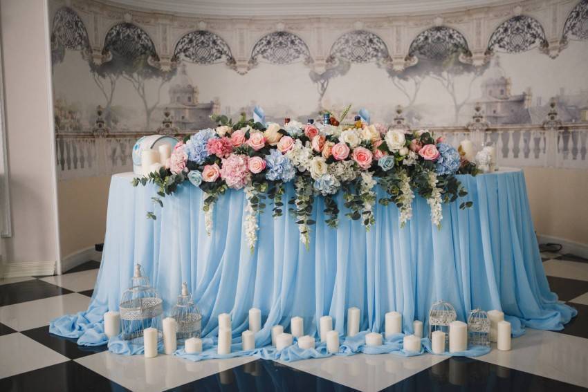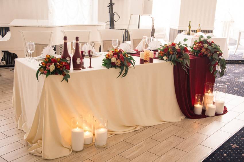 Стол, за которым будут сидеть новоиспеченные муж и жена, должен выделяться среди общего убранства и быть в одном стиле с другими элементами. Прекрасным убранством свадебного стола своими руками станет юбка из фатина или тюли. Оригинальным украшением будет композиция из живых цветов, которая, как правило, имеет продолговатую форму и размещается в центре. Декор свадебного стола можно дополнить бантами из атласных полосок.