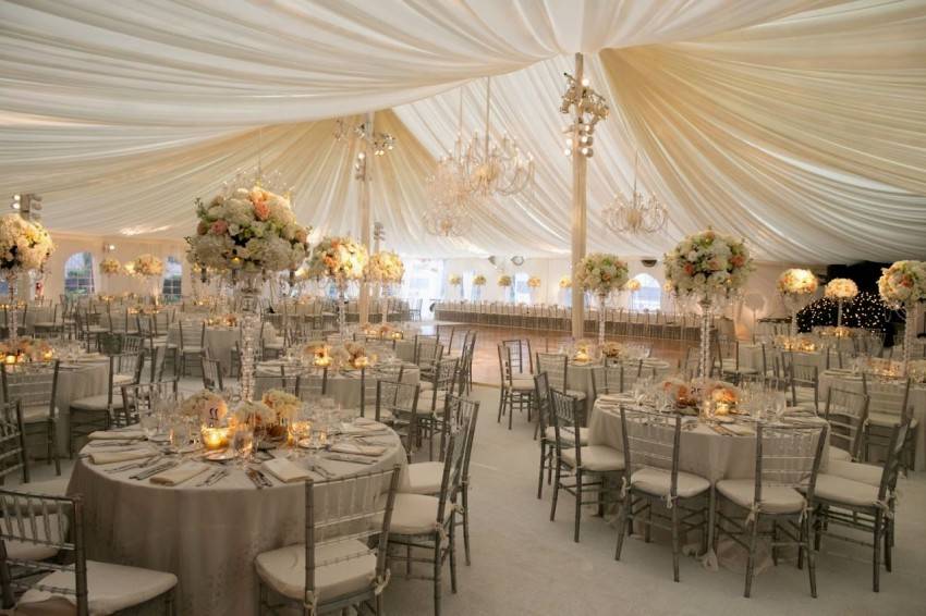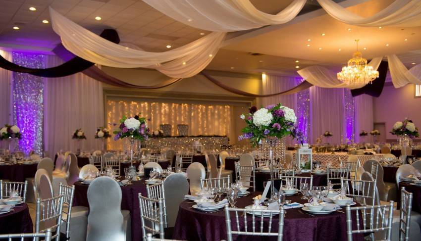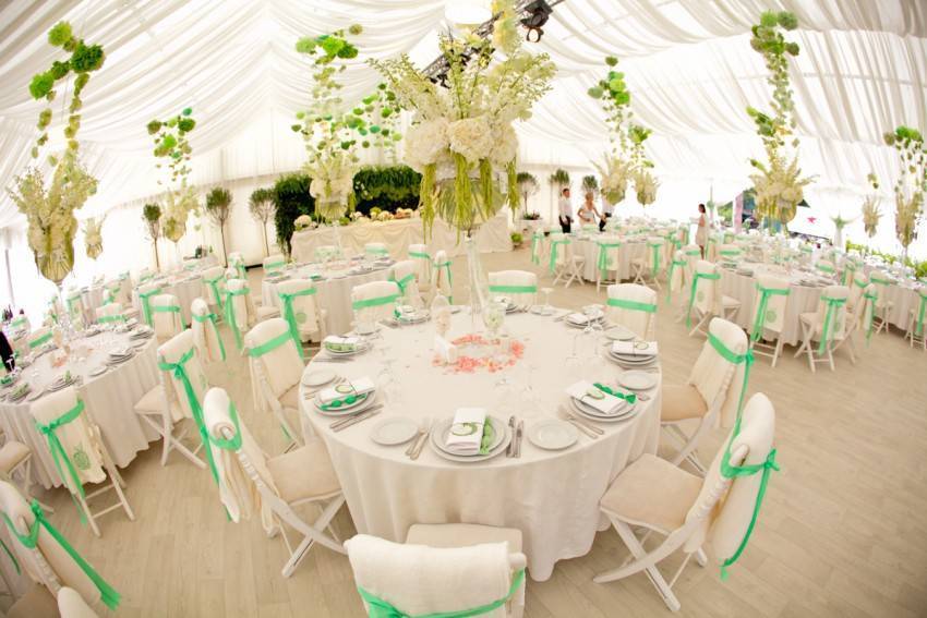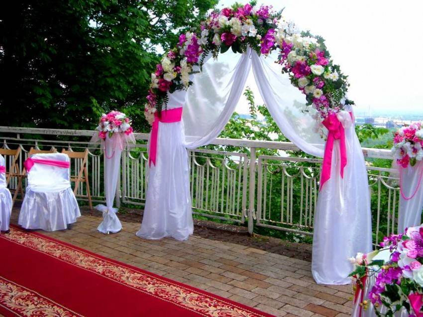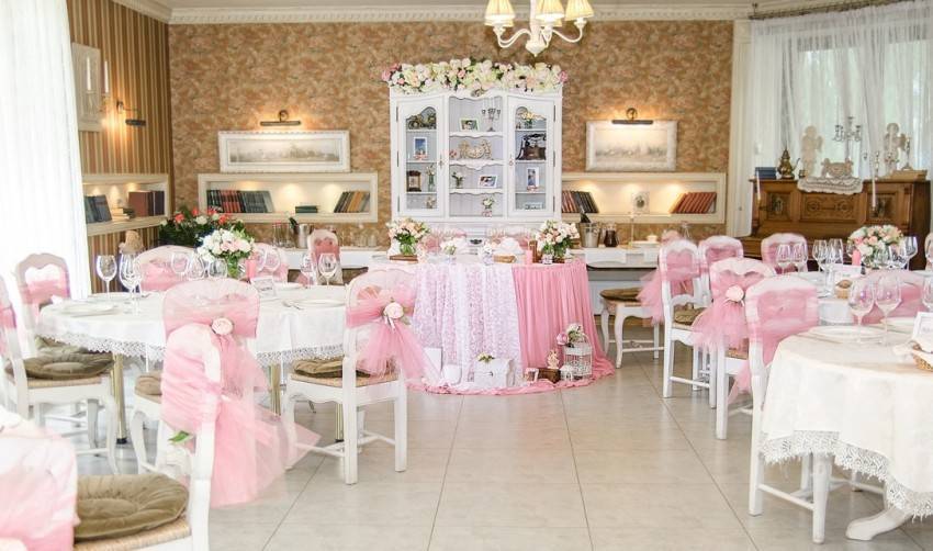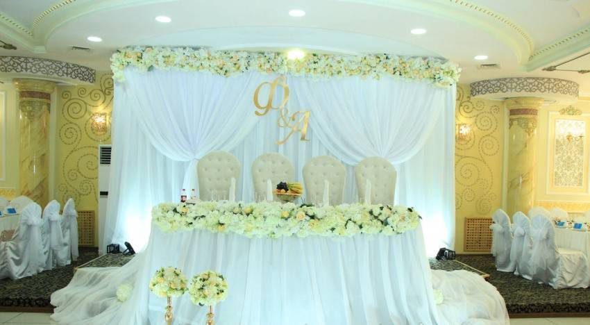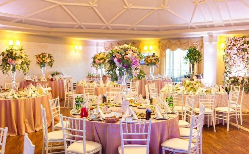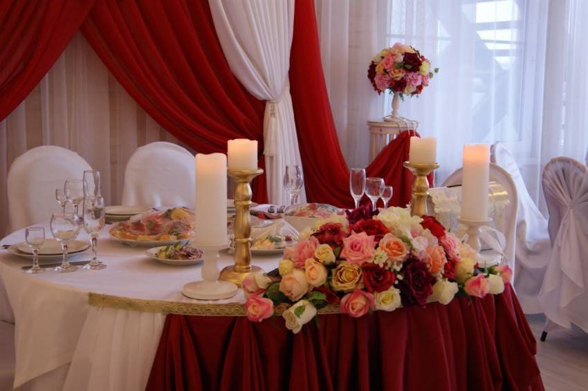 Банкетный зал, как правило, украшается владельцами заведения. Но если пару что-то не устраивает, и они хотят приложить свою руку к общему убранству, существует много достойных вариантов. Все элементы должны быть выдержаны в одном стиле. Для данного мероприятия преимущественно использование тканевой драпировки, оригинальных скатертей и атласных лоскутов. Цветовая гамма всех элементов может быть как одного оттенка, так и нескольких. Самое главное, чтобы они гармонировали между собой.