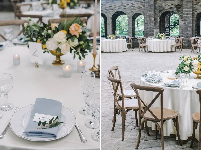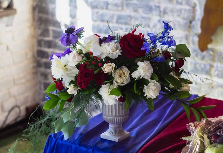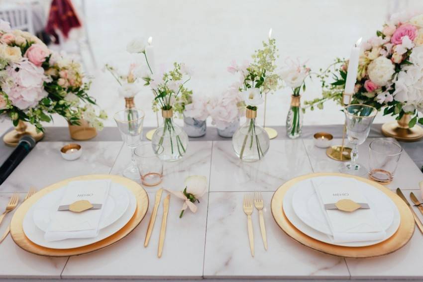 - Пышные и небольшие букеты, перевязанные лентами. Отдельные бутоны цветов, уложенные в чаши, рядом с тарелками, между предметами сервировки.