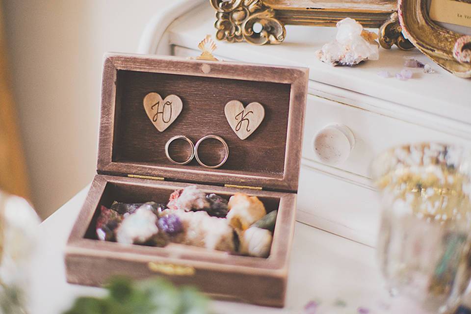Деревянная шкатулка для обручальных колец заиграет новыми красками, если уделить время декорированию. На изделии выжигают или вырезают имена новобрачных, рисуют герб или монограмму молодой семьи.
