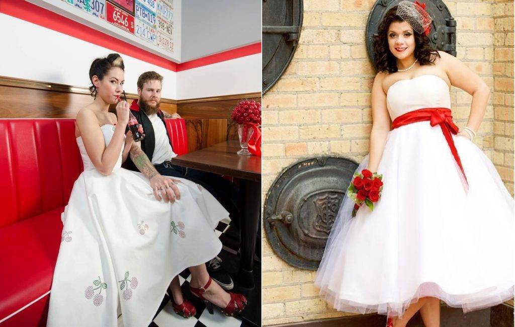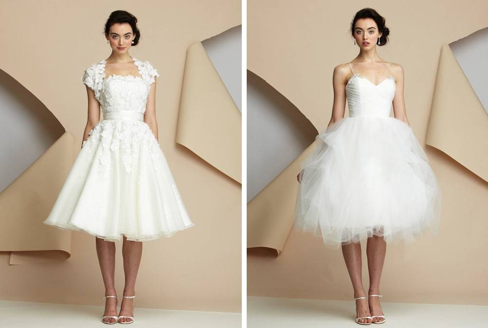- Короткие свадебные платья. Стиль ретро характерен также и короткими платьями для невест, который сразу же выделяет их из общей толпы. Данный стиль характеризуется пышной короткой юбкой, широким поясом, который выгодно подчеркивает талию или корсетом