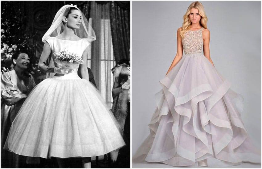 Сейчас: современная свадебная мода активнее всего заимствует из 50-х пышные цветочные юбки, делая их еще более пышными, воздушными — настоящее платье принцессы, как в актуальной коллекции Hayley Paige.
