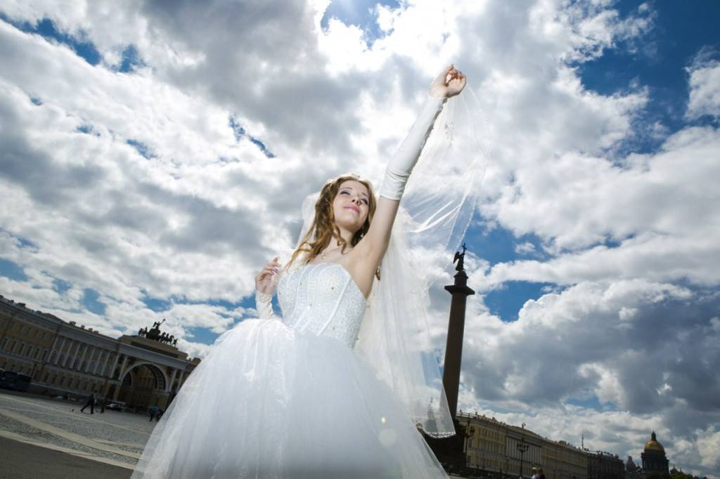 Во-первых, работать с полной отдачей. Написать сценарий для прогулки молодожёнов, взять с собой какую-то яркую бутафорию, подходящую для хороших кадров. Пригодится даже пудреница с зеркалом – чаще всего у невесты нет самого необходимого под рукой.