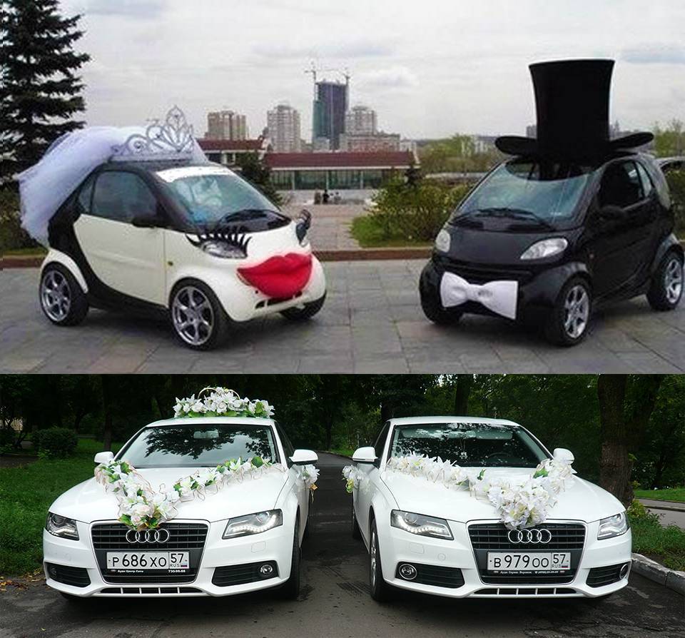 Номера машин можно заклеить шуточными табличками. Виниловые стикеры продаются в магазинах, которые специализируются на свадебной символике.