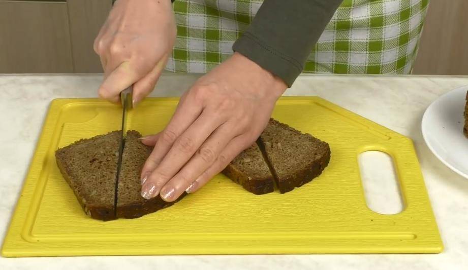 Хлеб нашинковать кусочками, а потом каждый из них поделить надвое по диагонали.