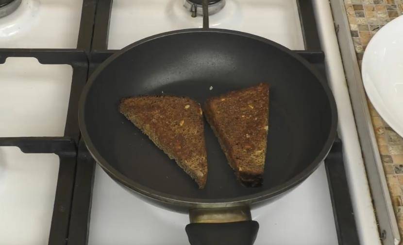 1) Нарезанный небольшими квадратными кусочками хлеб обжаривается на сковородке (с использованием сливочного масла) или подрумянивается в тостере.