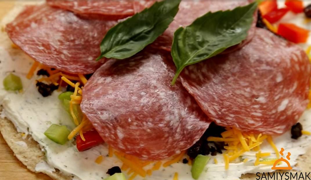 Покройте тонкими ломтиками колбасы. Положите базилик.