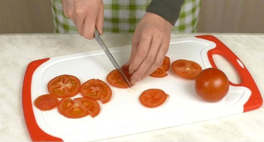 Выдавить через чеснокодавку чеснок в майонез. Натереть отварные яйца на крупной терке, помидоры нашинковать половинками кружков.