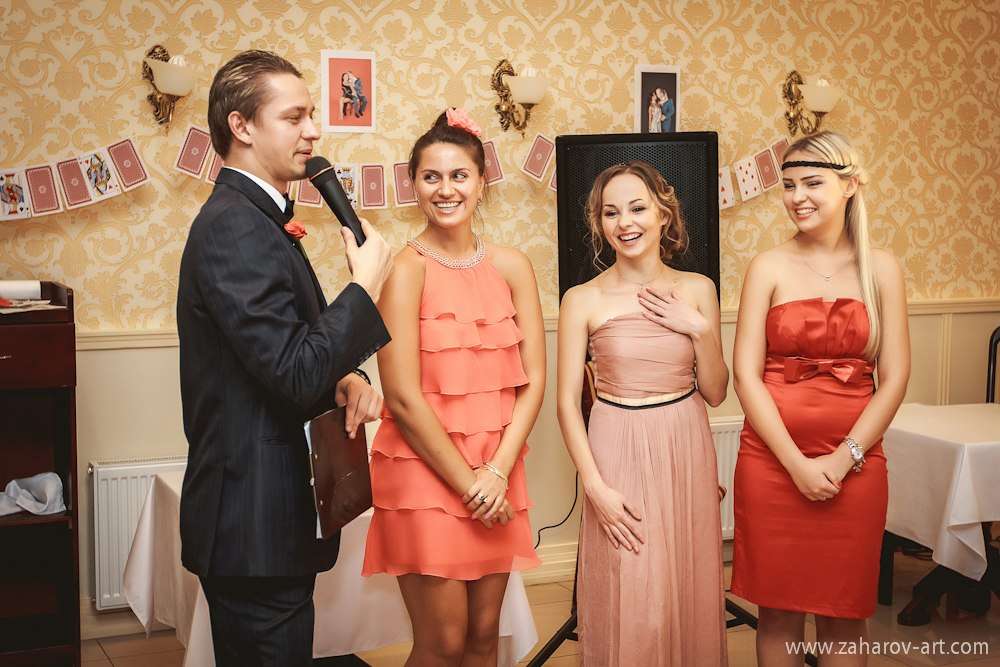 - Непростая история. Участвуют 5 девушек. Четверо стоят за дверью, они не должны слышать, что происходит на корпоративе. Задача такая: первая начинает рассказывать смешной случай в коллективе – всего 3 предложения. По сигналу приглашается вторая девушка для продолжения, потом третья и т. д. Кто-то обязательно записывает конкурс на видео, потом непростую историю могут прослушать сами участницы.