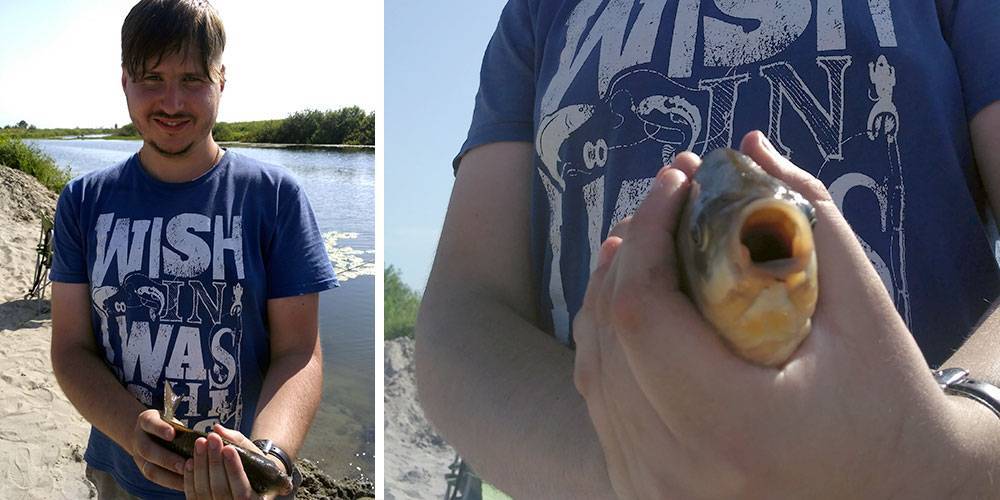 Очень жаль, но приехали мы на водоем довольно поздно. Солнце уже палило, как на лучших пляжах Таиланда. Надежды на поимку трофейного карпа таяли. В такую жару он клюет на рассвете, или вообще ночью. Зато почти сразу последовали поклевки мелочи, ее тут довольно много. Первым, как и полагается главнокомандующему, открыл счет Дима ака admin! Но тут же я сравнял счет 1:1 – опасно давать фору такому удачливому рыболову Впрочем, в итоге нам все равно стало понятно, что состязаться с ним сегодня бесполезно. Слишком сильны его ауристические способности к приманиванию рыбы… Как только Дмитрий подходил к фидерам и удочкам, на них почему-то сразу начинало клевать!