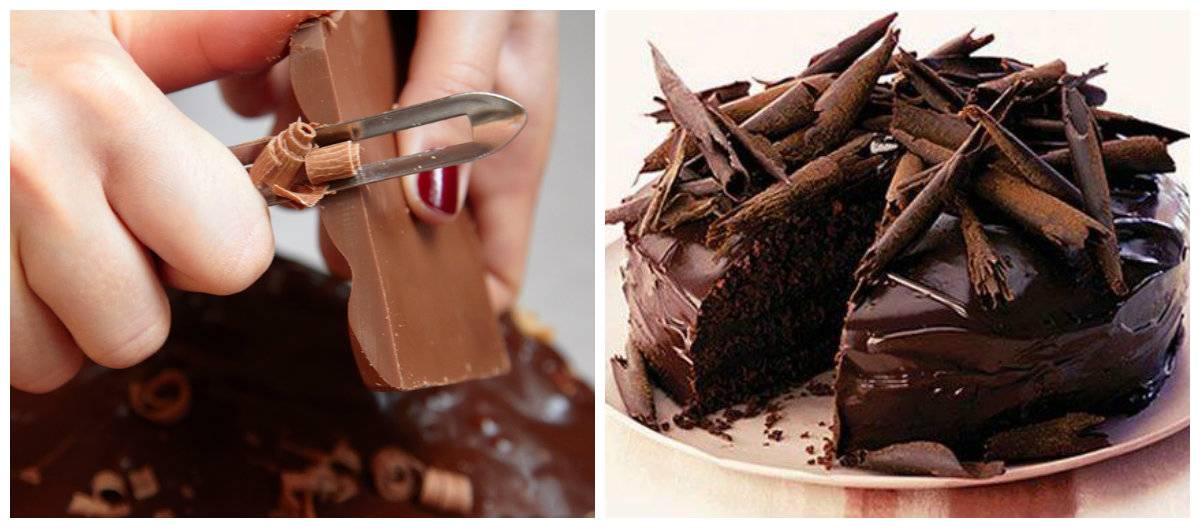 Самый простой способ – измельчить шоколадку и посыпать получившейся стружкой торт. Можно попробовать более сложный метод: для этого шоколадку оставляют в теплом месте на короткое время, чтобы она стала более мягкой. Затем острым ножом с плитки срезают тонкие длинные стружки. Они сразу начинают закручиваться, и чтобы зафиксировать форму, их ставят в холодное место для застывания.